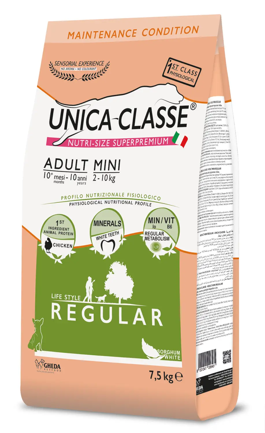 Сухой животный белок (в том числе куриный — 7%*), пшеничные отруби, кукуруза, животный жир, белое сорго (5%), кукурузная мука «фиоретто»,рис, кукурузный глютен, кукурузные отруби, гидролизованные животные белки, мука из рожкового дерева, дрожжевые продукты, триполифосфат натрия (0,05%),* количество, эквивалентное 21% куриного филе, подвергнутого регидратации.